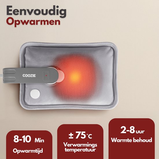 Plus de soucis d'eau chaude ou de fuites. La bouillotte électrique Coozie n'a pas besoin d'être remplie et chauffe en toute sécurité jusqu'à une température confortable de 65°C. Grâce à sa conception étanche et à son chauffage efficace, elle constitue une excellente alternative à la bouillotte traditionnelle, au coussin chauffant ou au sac chauffant qui doivent être chauffés au micro-ondes.