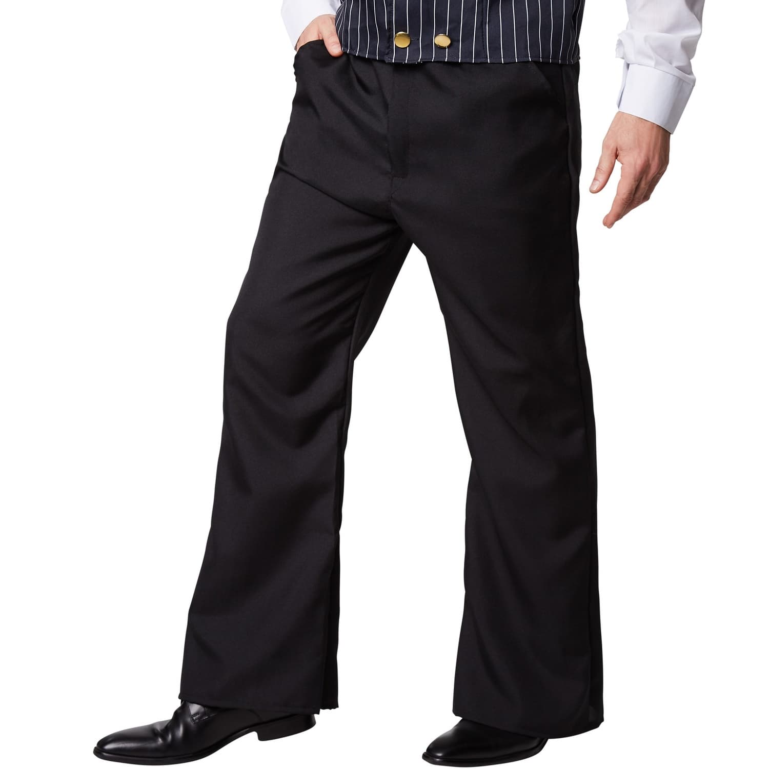 Cet élégant costume de gentleman Charleston ramène l'élégance des années 1920 à n'importe quelle fête. L'ensemble se compose d'une chemise blanche impeccable, d'un gilet à fines rayures orné d'une fleur artificielle décorative et d'un pantalon long noir. et d'un pantalon long noir qui, ensemble, créent un look classique et rétro convaincant. Le chapeau assorti complète l'ensemble et crée une atmosphère Charleston authentique.