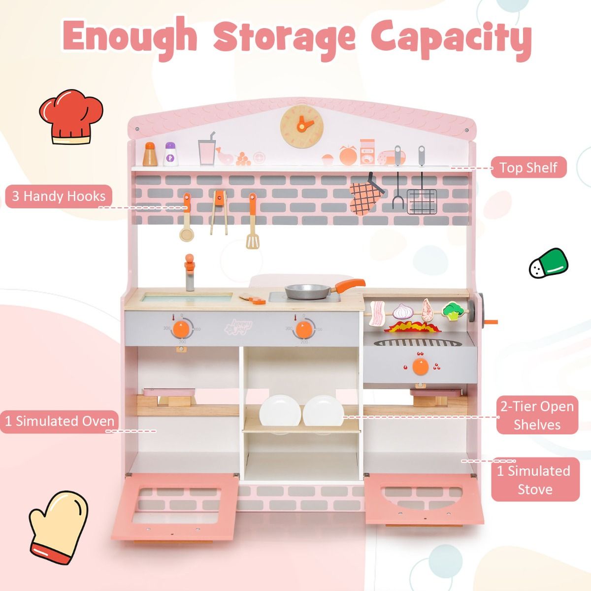 Notre cuisine ludique double face comprend une cuisine et un coin repas dépliables avec 2 sièges pour un jeu de cuisine et de repas immersif. Votre enfant peut faire semblant de laver, de cuisiner, de faire un barbecue ou de cuire au four dans l'espace cuisine ou faire semblant de boire un café ou de manger dans le petit restaurant. Il y a 3 crochets, 2 étagères ouvertes, 1 cuisinière, 1 four et 1 étagère supérieure pour différents accessoires. Ce jouet de haute qualité peut être utilisé pendant longtemps.