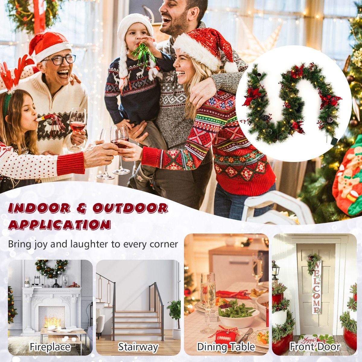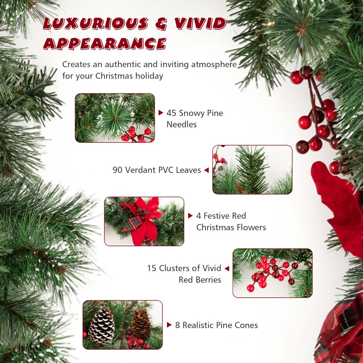 La guirlande est composée de deux types de feuilles : des aiguilles de pin enneigées et des branches vertes en PVC. Cela donne un aspect plein et vivant qui impressionne de près comme de loin. La décoration est complétée par des fleurs de Noël rouges, des baies rouge vif et des pommes de pin réalistes. Chaque détail a été soigneusement placé pour créer un aspect harmonieux et luxueux.