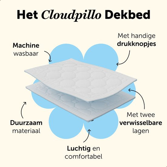 Rencontrez la couette Cloudpillo : la couette parfaite pour toutes les saisons. Adaptez-la facilement à la saison grâce à ses deux couches. Utilisez le côté bleu pour l'été et le printemps, le côté noir pour l'automne et combinez les deux côtés pour l'hiver. Vous dormirez ainsi toujours confortablement !