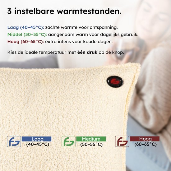 Placez la banque d'alimentation à l'intérieur du coussin, sélectionnez le réglage souhaité et profitez d'une chaleur instantanée. La housse est facilement amovible et lavable, de sorte que votre coussin chauffant restera toujours propre et frais.