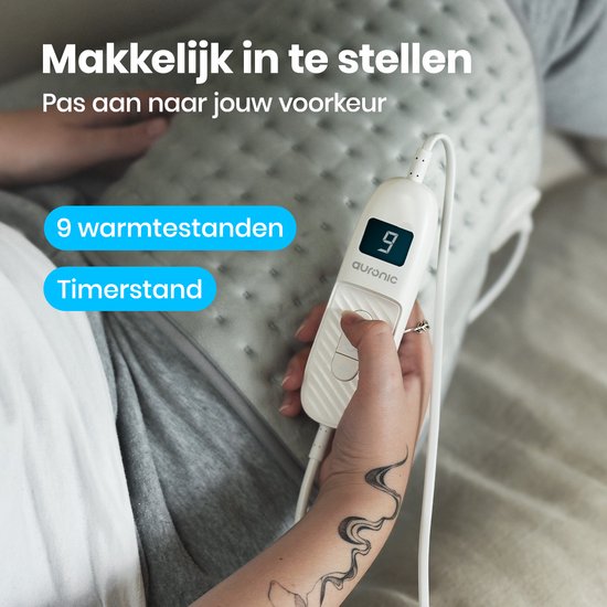 Le coussin chauffant électrique Auronic propose pas moins de neuf réglages de chaleur différents. Vous pouvez facilement les régler à l'aide de la télécommande. L'écran LED lumineux vous indique exactement le réglage sélectionné. De plus, la minuterie réglable vous permet de décider de la durée du traitement thermique. Pour plus de sécurité, le coussin est également protégé contre la surchauffe et s'éteint automatiquement après 90 minutes.