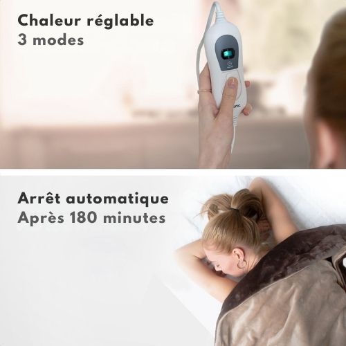 Selon votre choix, vous pouvez séléctionner 3 différents niveaux de chaleurs avec la couverture. De plus, cette couverture est facile à utiliser. Elle s'éteint automatiquement après 180 minutes et dispose d'une protection contre la surchauffe. La matière flanelle extra douce et respirante peut être lavée à la main.