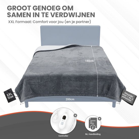La taille généreuse de 200 × 180 cm offre suffisamment d'espace pour partager confortablement ou s'emmitoufler complètement. Le tissu flanelle extra doux offre une sensation agréable, tandis que les trois réglages de chaleur vous permettent de contrôler la température parfaite. Grâce à l'arrêt automatique et à la protection contre la surchauffe, vous pouvez profiter de la chaleur en toute sérénité.