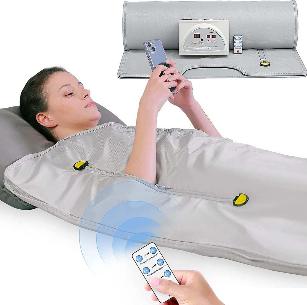 La couverture infrarouge est dotée d'une double fermeture éclair par laquelle les deux bras peuvent passer. Vous pouvez ainsi lire un livre ou jouer à un jeu sur votre téléphone pendant votre moment de détente. Grâce à la télécommande, vous pouvez régler entièrement l'appareil sans avoir à sortir de la couverture. Commencez votre moment de détente quand vous le souhaitez.