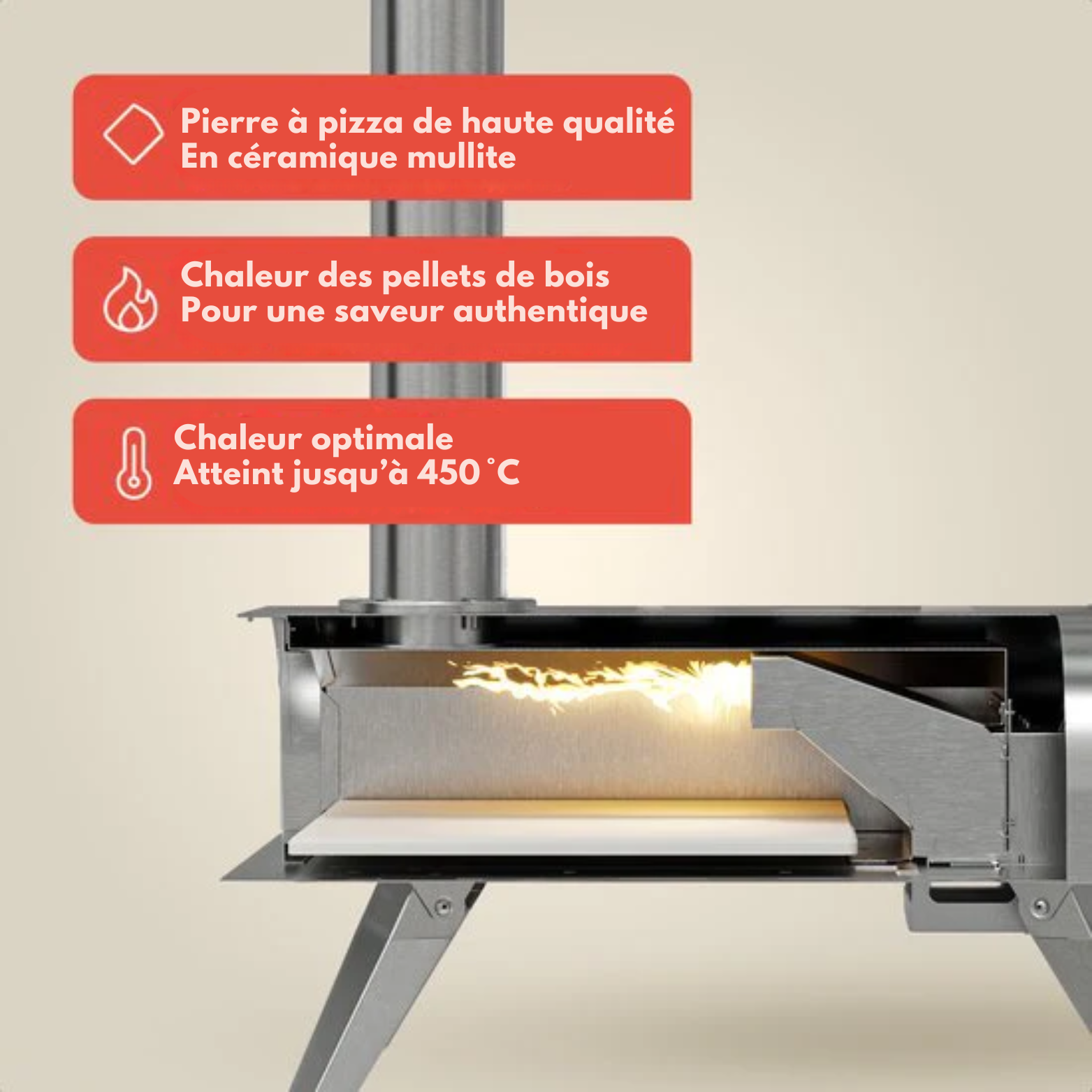 Ce four à pizza a été conçu dans un souci de facilité d'utilisation. Son design pliable le rend compact et facile à ranger lorsqu'il n'est pas utilisé. Il est parfait pour ceux qui disposent d'un espace de rangement limité, mais qui souhaitent tout de même déguster des pizzas fraîchement cuites et faites maison. Vous pouvez également utiliser le couvercle de la cheminée comme pelle pour vos granulés de bois.