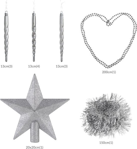 L'ensemble de 77 pièces se compose de 77 pièces (boules, étoiles, glaçons, etc.) dans différentes tailles/décors :