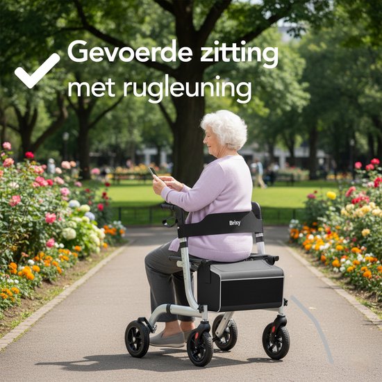 Le déambulateur Brixy est équipé d'un siège et d'un dossier souples pour que vous puissiez toujours faire une pause lorsque vous marchez. pour que vous puissiez toujours faire une pause lorsque vous en avez besoin. Le siège est robuste, confortable et suffisamment large pour que vous puissiez vous asseoir en toute sécurité. De plus, le déambulateur est doté d'un frein de stationnement, idéal pour faire des courses ou de longues promenades.