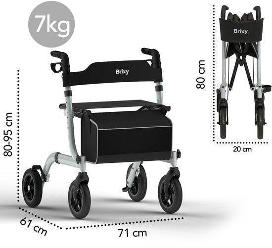 Le rollator Brixy ne pèse que 7 kg et est facile à plier. D'un seul geste, vous pliez le déambulateur et le rangez facilement, que vous soyez en voiture ou à la maison. Il est donc idéal pour les déplacements ou pour gagner de la place. Le rollator est très robuste et possède une capacité de charge impressionnante de 140 kg.