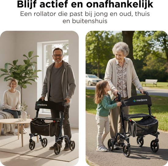 Avec le déambulateur Medzone, vous pouvez vous diriger vers la porte en toute confiance. Le cadre robuste mais léger vous donne l'assurance dont vous avez besoin, tandis que les poignées réglables et le siège souple avec dossier assurent un confort durable.