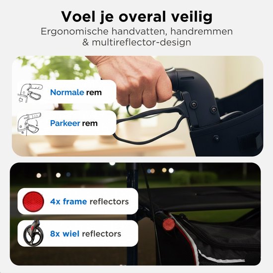 - Sécurité: 12 réflecteurs (roues/cadre), dossier large, siège confortable