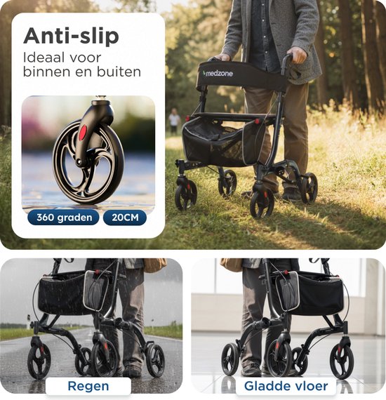 Grâce aux freins fiables et aux roues solides, vous resterez toujours debout, que vous marchiez à l'intérieur ou à l'extérieur. Le sac à provisions et le support pour votre canne ou votre parapluie le rendent encore plus pratique. Avec le déambulateur Medzone, vous conservez votre indépendance.
