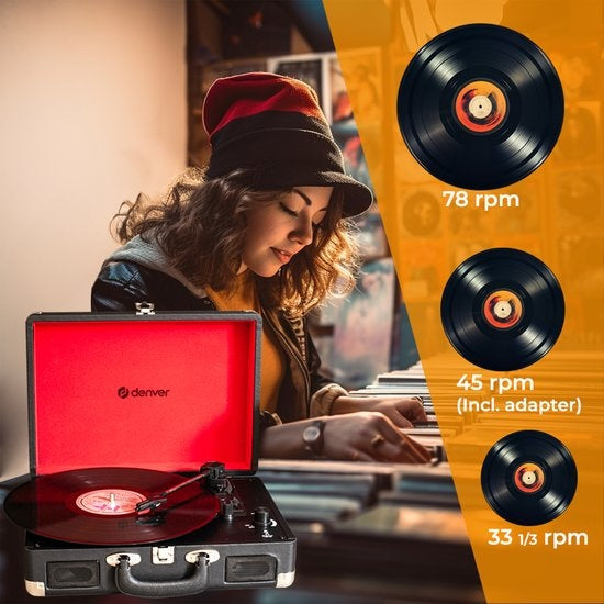 Facilement transportable grâce à sa poignée et facile à ranger lorsqu'elle n'est pas utilisée. Tourne-disque à entraînement par courroie avec 3 vitesses (33 1/3, 45 et 78 tours/minute). Comprend un adaptateur pour disque 45 tours (trou central plus grand dans le disque).