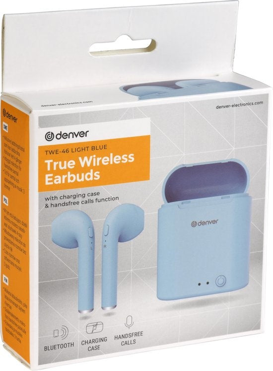Denver TWE-46 - Earbuds - Wireless - Draadloos Oordopjes - Bluetooth - met oplaad case - handsfree - sporten - headset - In-ear - Bluetooth 5.0 - Licht blauw
