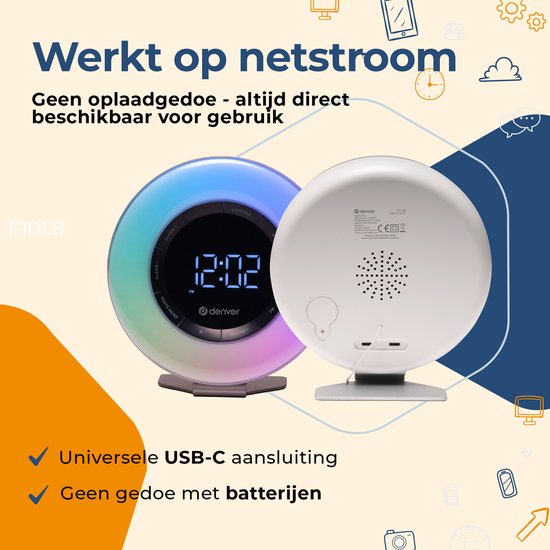 Démarrez chaque matin en pleine forme avec le Denver CRL-342 - le réveil radio multifonction garantit un début de journée relaxant avec la bonne ambiance. L'option de réveil en douceur avec la lumière de réveil ou la possibilité de choisir les sons de la nature ou la radio FM offre toujours une option qui vous convient. L'endormissement devient également facile grâce à la fonction bruit blanc. Bref, le partenaire idéal pour une journée calme et reposante.