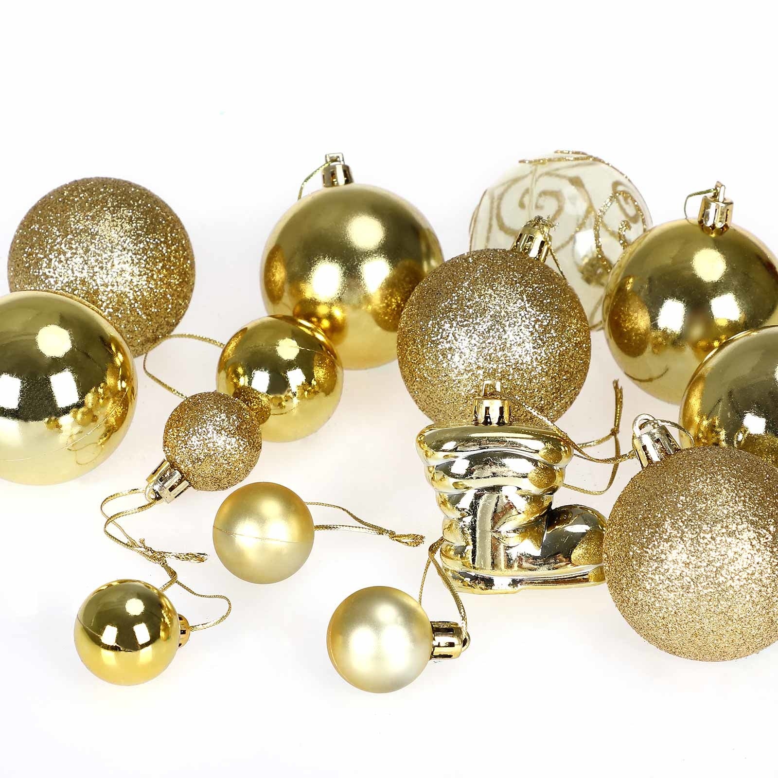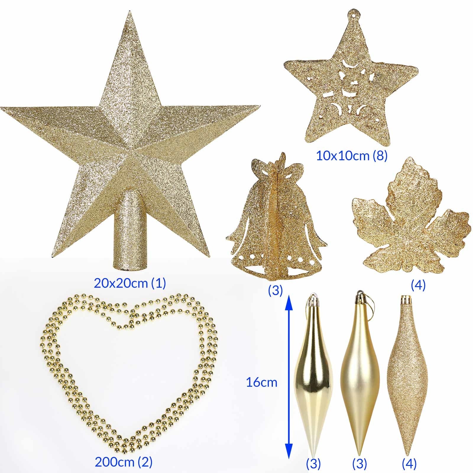Le set 102 est composé de 102 pièces (boules, bottes, étoiles, cônes, etc.) de différentes tailles/décorations: