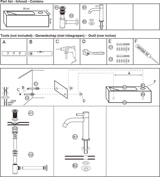 - Inclut un robinet d'eau froide, un bouchon de vidange et un siphon indéfini.