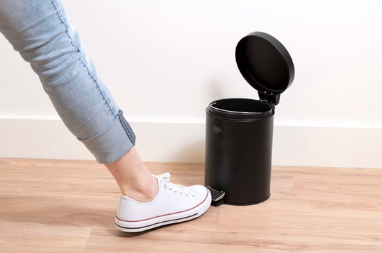 Comme le nom l'indique, vous ouvrez la petite poubelle en appuyant avec votre pied.en appuyant sur la pédale. Cela évite de se pencher. Très pratique, car la poubelle est très petite et compacte. C'est vraiment une poubelle destinée aux petits déchets. La poubelle à pédale possède également une boucle métallique à l'arrière pour que vous puissiez la ramasser sans toucher la poubelle elle-même.