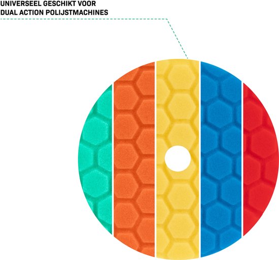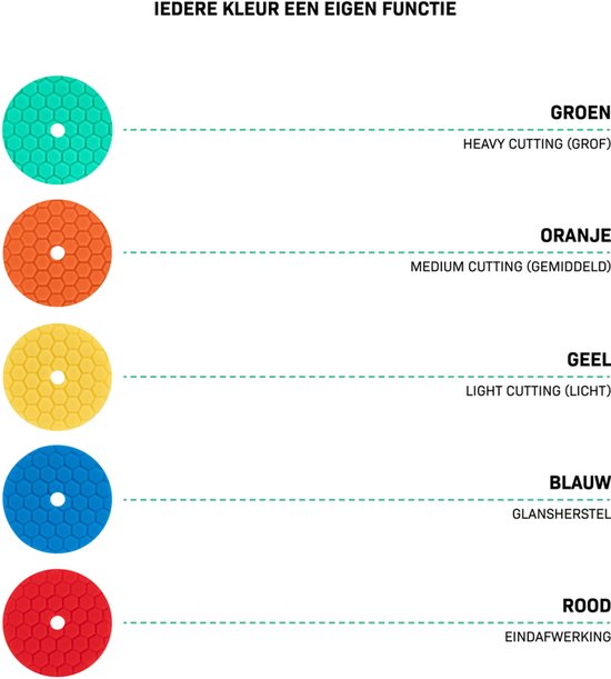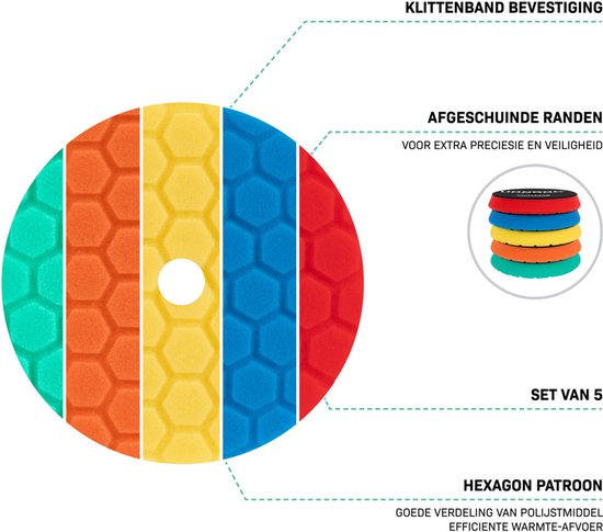 Les disques de polissage sont équipés de bords biseautés, ce qui facilite le travail dans les coins difficiles d'accès et empêche la machine ou le support d'entrer en contact avec la peinture ou la surface. En outre, le motif hexagonal assure une répartition optimale du polissage et une dissipation efficace de la chaleur. Les disques sont classés par couleur et par fonction, ce qui vous permet de toujours choisir le bon tampon pour la tâche à accomplir: