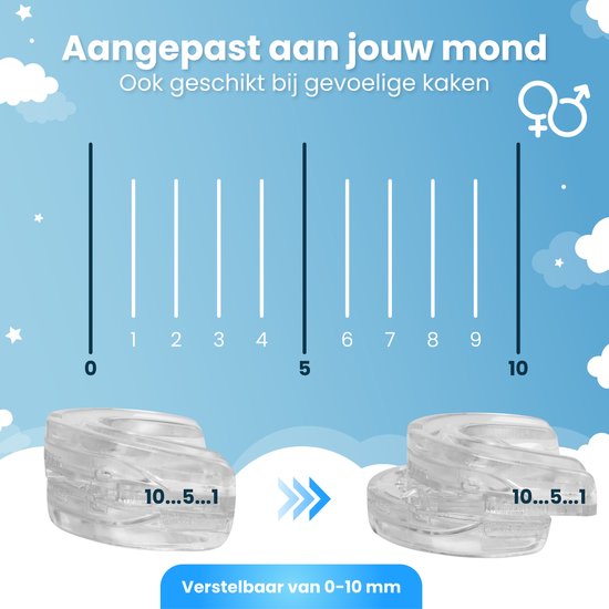 Avec une ouverture réglable de 0 à 10 mm, vous pouvez parfaitement adapter l'orthèse anti-ronflement à votre dentition. Votre mâchoire inférieure reste ainsi dans une position agréable, ce qui favorise la circulation de l'air et peut contribuer à une nuit de sommeil paisible. Une nuit paisible commence par un ajustement idéal.