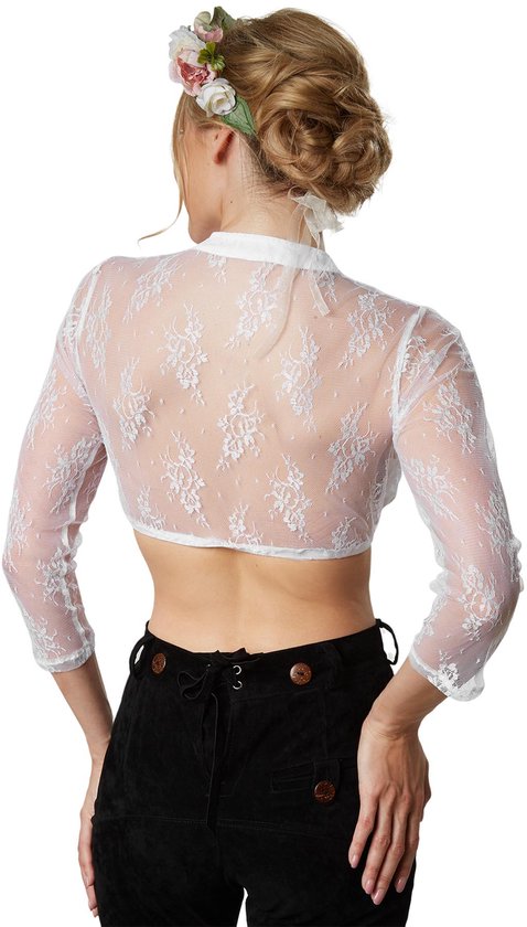 La magnifique blouse dirndl Gretl offre un look séduisant. Ce vêtement d'un blanc éclatant est entièrement fermé sur le devant. Le dos et les manches longues sont recouverts de dentelle uniquement, ce qui en fait un véritable accroche-regard. Une bande élastique au bas de la blouse assure un ajustement idéal ; la matière est composée de 95 % de polyester et de 5 % d'élasthanne.