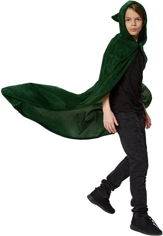Ce costume unisexe pour enfant, la cape verte en velours, est conçu avec une cape sans manches, une fermeture velcro à la hauteur de l'encolure et une capuche pointue, en 100% polyester.