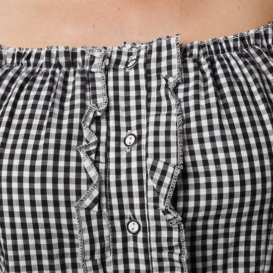 La blouse de tailleur écossaise Stefferl illustre parfaitement pourquoi les modèles sans épaules sont si séduisants. Des franges accentuent l'encolure, tandis que la matière élastique en caoutchouc assure un ajustement idéal. Les manches courtes sont également ornées de franges et de détails élastiques. Les boutons sont entourés des mêmes franges ludiques des deux côtés. La dentelle élégante située au bas de la blouse est un élément qui attire l'attention dans le dos et qui permet d'obtenir une taille flatteuse. Cette blouse est faite à 100 % de coton, ce qui contribue à son grand confort.