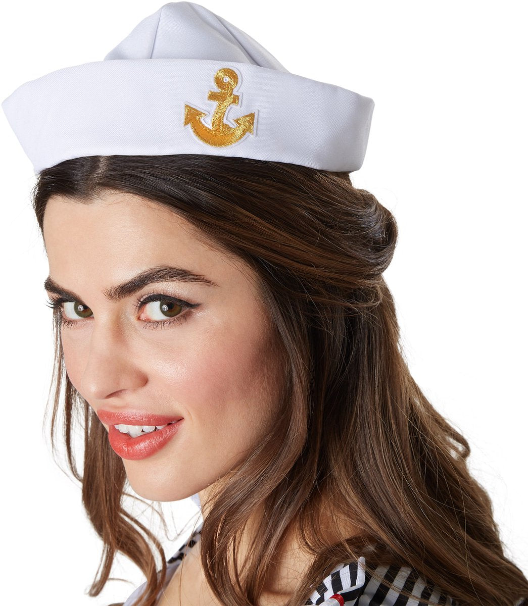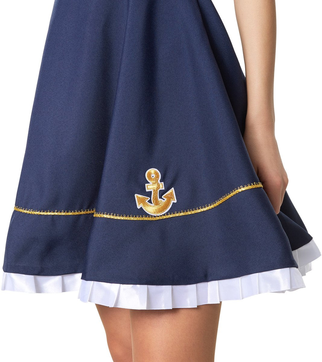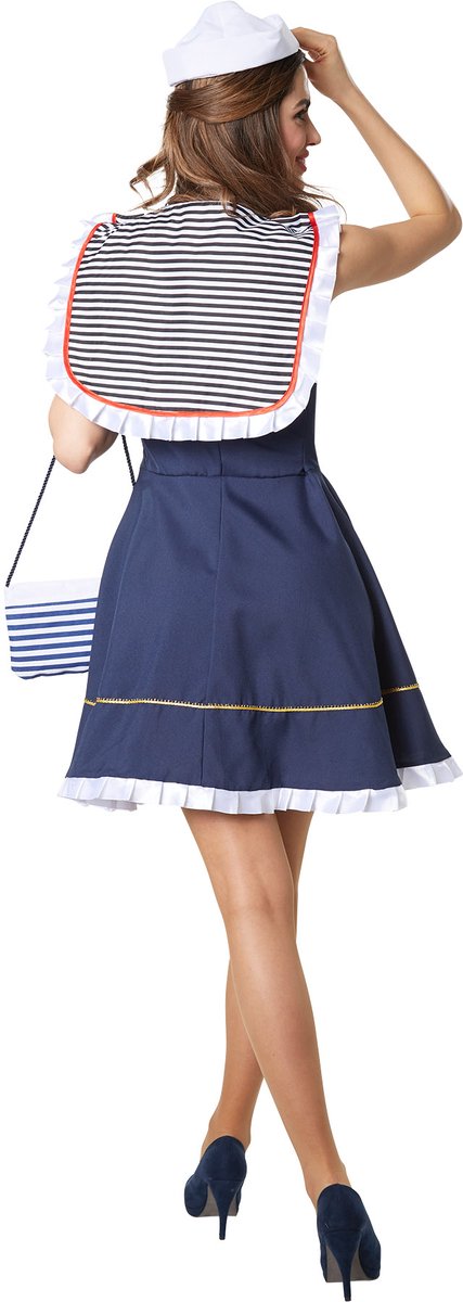 Le déguisement de marin pour femme se compose d'une robe et d'un chapeau. La robe bleu marine se ferme par une fermeture éclair sur le côté, elle est sans manches et coupée court. L'encolure large a des franges blanches avec un ourlet rouge et un empiècement de tissu rayé noir et blanc qui se prolonge vers l'arrière dans le col marin typique. Dans la partie décolletée se trouve un détail de tissu cousu avec un bouton. La jupe légèrement évasée est ornée de six boutons décoratifs dorés sur deux rangées dans la partie supérieure. La partie inférieure est ornée d'une bordure décorative dorée et d'une ancre dorée cousue, la bordure étant formée de franges décoratives blanches repassées. Le chapeau avec l'écusson doré de l'ancre donne la touche finale au déguisement. Matière : 100 % polyester. La mer, c'est amusant, la mer, c'est beau - surtout quand il y a une vraie mariée marin à bord. Son regard rend l'air salé de la mer plus doux. La robe moulante permet de mettre en valeur le décolleté et les jambes. Le chapeau de marin blanc donne à la tenue une touche de coquetterie. Qui n'a pas envie d'atterrir en compagnie de cette impertinente mariée à la marinière ? Points forts : Robe courte sans manches avec fermeture éclair Encolure large avec froufrous et détails en tissu Jupe avec boutons, écusson d'ancre et froufrous décoratifs Inclut un chapeau de marin élégant Remarques Chaussures et sac à main non inclus