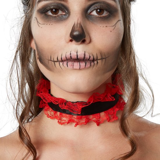 Ce costume d'amant effrayant pour femme est ajusté et ne comporte ni manches ni bretelles. Le décolleté est terminé par des volants, tandis que plusieurs garnitures en dentelle sur le devant sont en forme de nœuds. Sous ces détails se trouve un écusson en forme de cœur sur la poitrine gauche. Fabriquée en satin, la jupe présente une construction en couches avec des jupes supérieures en dentelle et un magnifique ourlet en dentelle. En outre, une longue fermeture à glissière est placée dans le dos. L'encolure froufroutante et les manches courtes séparées, également en dentelle, complètent la tenue. Matière : 100 % polyester.