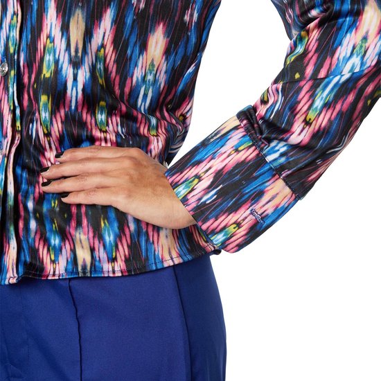 Le costume de reine du disco pour femme est composé de deux parties. Le pantalon a des jambes larges et peut être fermé par un bouton et une fermeture éclair. La ceinture du pantalon est élastique et dotée de passants. En outre, une couture plissée se trouve au bas de chaque jambe. Un chemisier à motif coloré et à manches longues, muni de boutons et d'un col, en 100 % polyester, accompagne le pantalon.