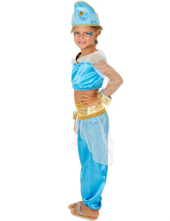 Le costume de fille d'une princesse orientale est composé d'un magnifique pantalon harem, d'un crop top et d'une charmante coiffe avec un voile. Le costume est confectionné en satin et en mousseline de soie. Il comporte également d'éblouissantes broderies dorées, le matériau étant 100 % polyester.