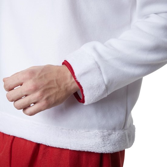 Le costume d'esquimau inventif pour homme est conçu dans une combinaison fraîche de blanc et de rouge. Le haut soigneusement confectionné comprend un pull à capuche. Les manches et l'ourlet présentent une luxueuse peluche blanche avec une bordure rouge accrocheuse. La casquette présente également un ourlet généreux en peluche. L'encolure est en velours rouge robuste à points carrés, avec une bordure décorative à motif floral, complétée par une frange en forme de crochet et des pompons. En outre, deux pompons en peluche sont attachés à l'encolure. Le pantalon en velours a une taille élastiquée et le même style de peluche blanche et de garniture rouge au bas que le haut. Une bordure en crochet avec des pompons a été ajoutée sur les tibias, en 100 pour cent polyester.