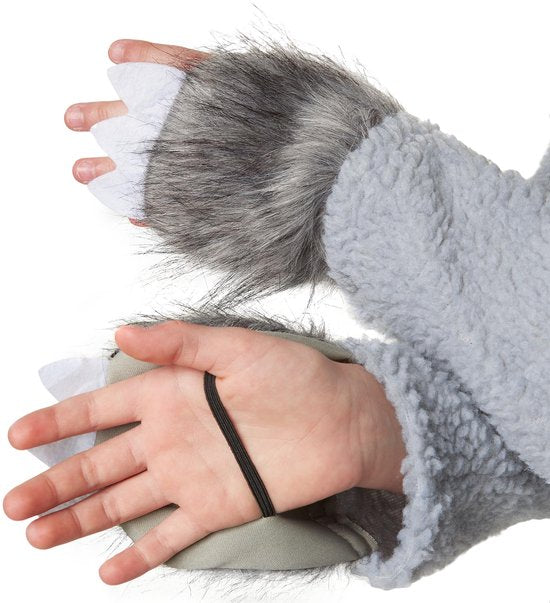 Le costume unisexe de loup sauvage comprend une combinaison et un sweat à capuche. Cette combinaison est fabriquée dans un tissu léger, rugueux et chaud. La longue fermeture éclair pratique à l'arrière permet d'enfiler et d'enlever facilement le costume. Au bas du dos se trouve une queue de loup en fourrure artificielle grise. Le costume est encore rehaussé par une pièce de fourrure artificielle grise au niveau du col. Le même matériau se retrouve sur les quatre pattes, qui sont fixées aux mains et aux pieds à l'aide d'un élastique. Le chapeau de loup avec oreilles inclus est en fourrure artificielle avec une doublure en tissu et s'attache sous le menton avec une fermeture velcro, le matériau est composé à 100 pour cent de polyester.