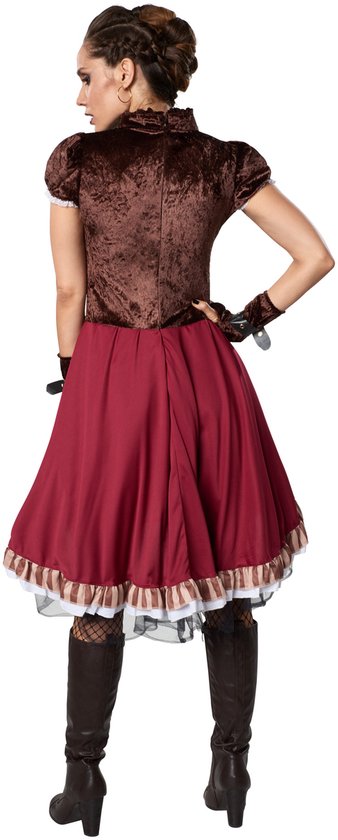Ce costume de style steampunk pour femmes nobles se compose d'une robe en satin à manches courtes. La section de la jupe magnifiquement finie comporte deux bretelles attachées verticalement avec des boucles qui accentuent le look. Le jupon est une combinaison de satin et de tulle délicat, ce qui lui confère un aspect luxueux. Deux bretelles horizontales sont cousues au centre de la partie supérieure, rappelant ainsi un gilet en cuir. Au-dessus, une élégante dentelle attire l'attention sur le décolleté. Les manches courtes en velours sont ornées de franges pour un aspect ludique. Un col en satin ferme joliment l'ensemble. Dans le dos, une fermeture à glissière très pratique. Le costume est complété par deux gants en satin sans doigts munis de lanières et de boucles, en 100 % polyester.