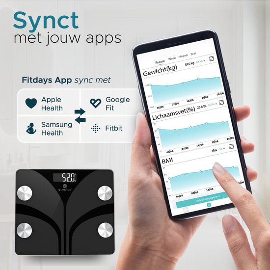 Vous pouvez synchroniser l'application Fitdays avec Apple Health, Samsung Health, FitBit et Google Fit. Réalisez votre objectif de forme physique avec la balance e.volve