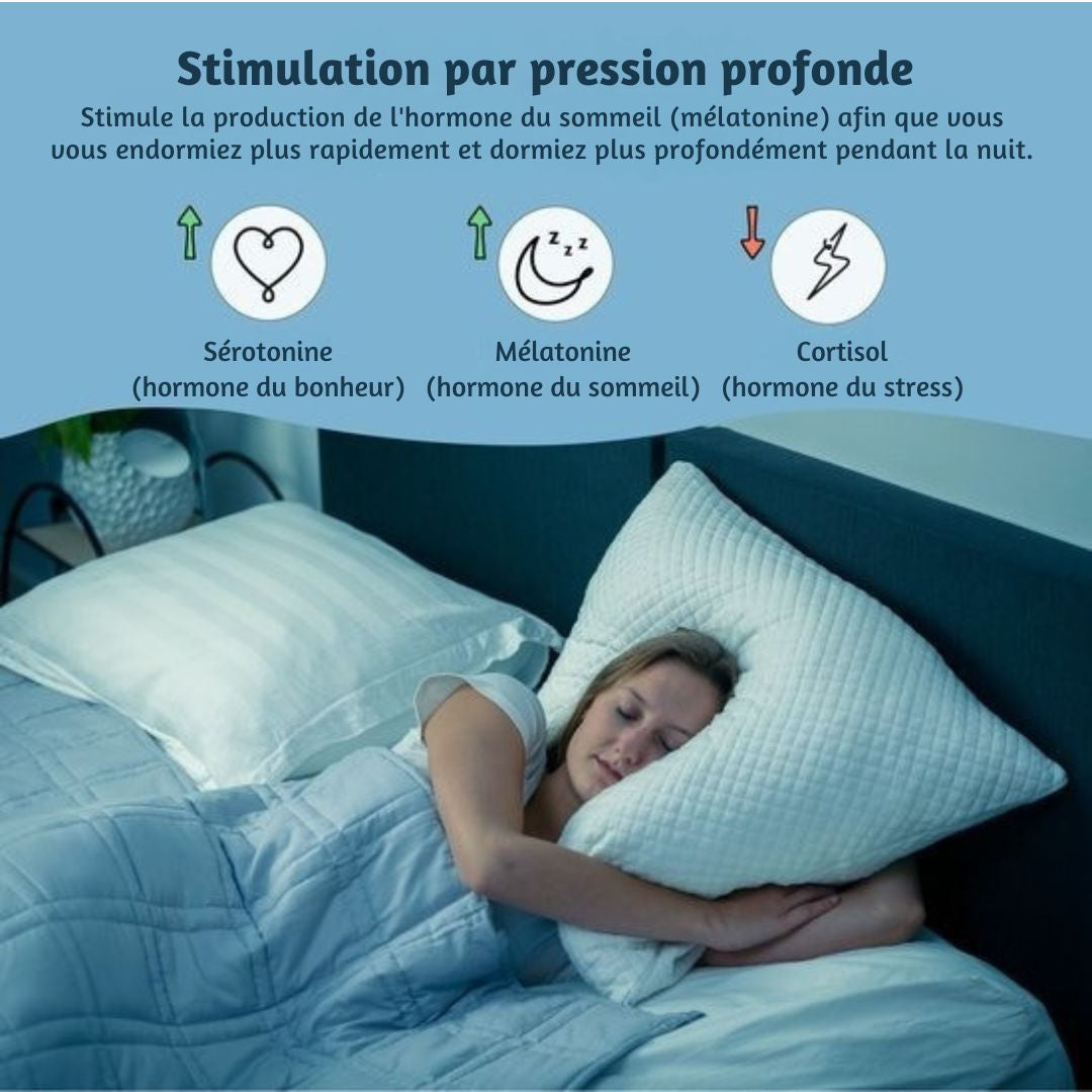 Grâce à une pression douce et enveloppante, comparable à un câlin, elle stimule la production de sérotonine et de mélatonine, les hormones clés de la détente et du sommeil. Résultat : un corps apaisé, un esprit plus calme et des nuits réellement reposantes.