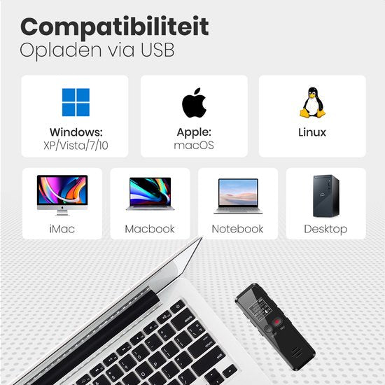 Vous pouvez recharger l'enregistreur vocal via le connecteur micro USB. Très pratique, plus besoin de s'encombrer de piles ! Le stockage interne fonctionne comme une clé USB. Avec un câble USB, vous pouvez facilement transférer des fichiers vers un disque dur externe, un ordinateur portable ou un Macbook. Ou ajoutez simplement des fichiers tels que de la musique à l'enregistreur vocal pour pouvoir l'utiliser comme lecteur MP3 !