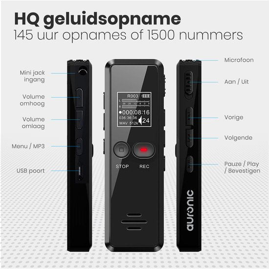 Vous souhaitez enregistrer et sauvegarder des conférences, des interviews, des réunions ou des cours ? Avec l'enregistreur vocal Auronic, vous êtes en mesure d'enregistrer jusqu'à 12 heures d'audio avant que la batterie ne s'épuise ! De plus, vous disposez de 8 Go de stockage interne, ce qui est suffisant pour 12 à 569 heures d'enregistrement. Cet appareil est compact, facile à utiliser et offre la meilleure qualité sonore de sa catégorie !