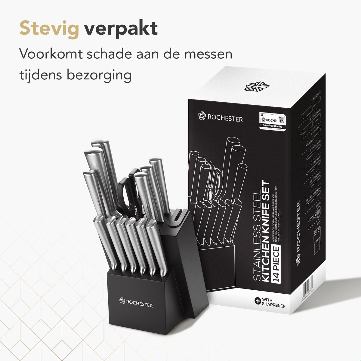 Ensemble de 14 couteaux avec bloc et aiguiseur de couteaux - Rochester - Acier inoxydable - Revêtement résistant aux rayures