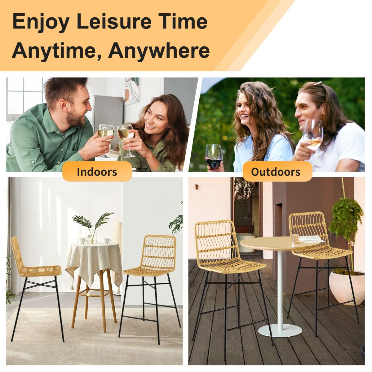 Robuste et durable: Soutenue par un cadre métallique renforcé et résistant à la rouille, chaque chaise est très stable et peut supporter une charge allant jusqu'à 120 kg. Grâce au matériau en osier PE et au cadre résistant à la rouille, les chaises conviennent à la fois à une utilisation à l'intérieur et à l'extérieur. Les coussins de pied réglables garantissent la stabilité des tabourets, même sur les sols irréguliers.