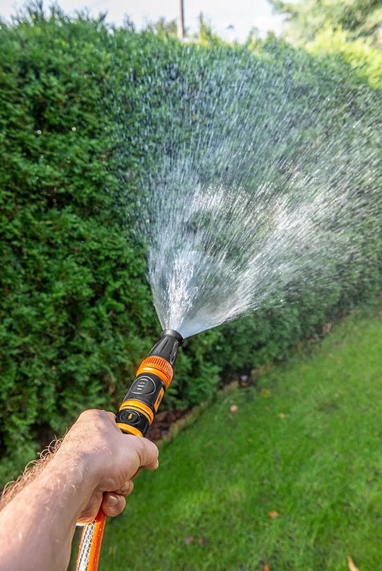 Le 15-801 30 mètres de tuyau est résistant aux UV et anti-algues, idéal pour divers travaux de jardinage. Le kit de démarrage 15-710 ajoute une commodité supplémentaire avec un pistolet de pulvérisation, des connecteurs de tuyau et un raccord de robinet. Facile à utiliser, fonctionnel et prêt pour un jardinage sans souci. Découvrez les avantages de l'ensemble NEO Hose Trolley !