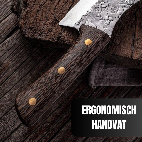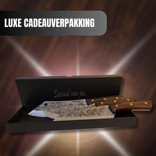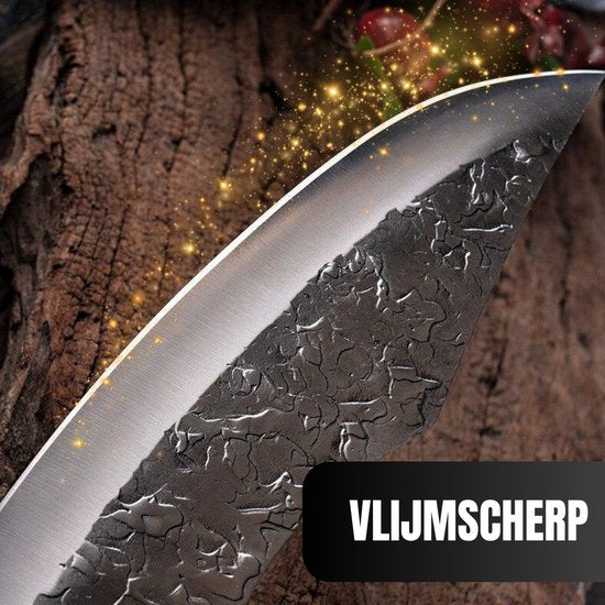 Notre set de couteaux professionnels Triology se compose de trois couteaux de chef de haute qualité. Les couteaux sont dotés d'une lame dont le cœur est en acier inoxydable robuste, d'une dureté de 5CR15. Le tranchant est particulièrement aiguisé et peut être facilement affûté. Autour de ce noyau, plusieurs couches d'acier élégamment martelé sont disposées. Les couteaux de chef sont donc non seulement extrêmement fonctionnels, mais ils attirent également tous les regards dans votre cuisine.