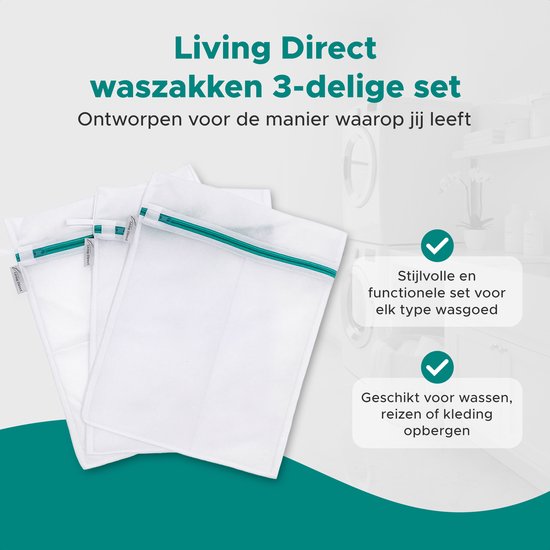 La solution ? L'ensemble de sacs à linge 3 pièces de Living Direct. Fabriqué en maille de première qualité, robuste et respirante, avec des fermetures éclair équipées d'une housse de protection. La combinaison intelligente des tailles permet de maintenir chaque vêtement ensemble en toute sécurité, de réduire les frottements et d'éviter que les vêtements ne s'accrochent. De plus, les poches sont légères et pliables : parfaites pour un rangement rapide et tout aussi utiles pour organiser votre valise ou votre sac de sport. Ainsi, votre linge reste en excellent état plus longtemps et vous lavez en toute sérénité, à chaque fois.