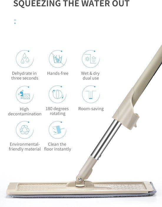 Il suffit de déplacer le grattoir de haut en bas pour sécher la vadrouille. Le grattoir est doté d'un peigne denté qui élimine les cheveux et la saleté de la serpillière, ce qui est extrêmement pratique. Le long manche est conçu pour la plupart des utilisateurs, ce qui réduit la nécessité de se pencher et de s'accroupir, économise de l'énergie et prévient les maux de dos qui peuvent résulter d'une flexion fréquente. En outre, le matériau en acier inoxydable est très durable, donc ne vous inquiétez pas de la rupture pendant l'utilisation ; il est adapté à une utilisation à long terme.
