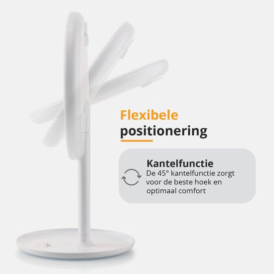 Pas de tracas avec les câbles.et le réglage. La batterie intégrée a une autonomie de 4 heures en utilisation normale. À la luminosité maximale, la batterie dure environ 1,5 heure. Vous pouvez facilement recharger le miroir à l'aide du câble USB-C inclus. Vous n'avez pas d'alimentation ? Alors vous pouvez aussi le brancher directement sur la prise murale.