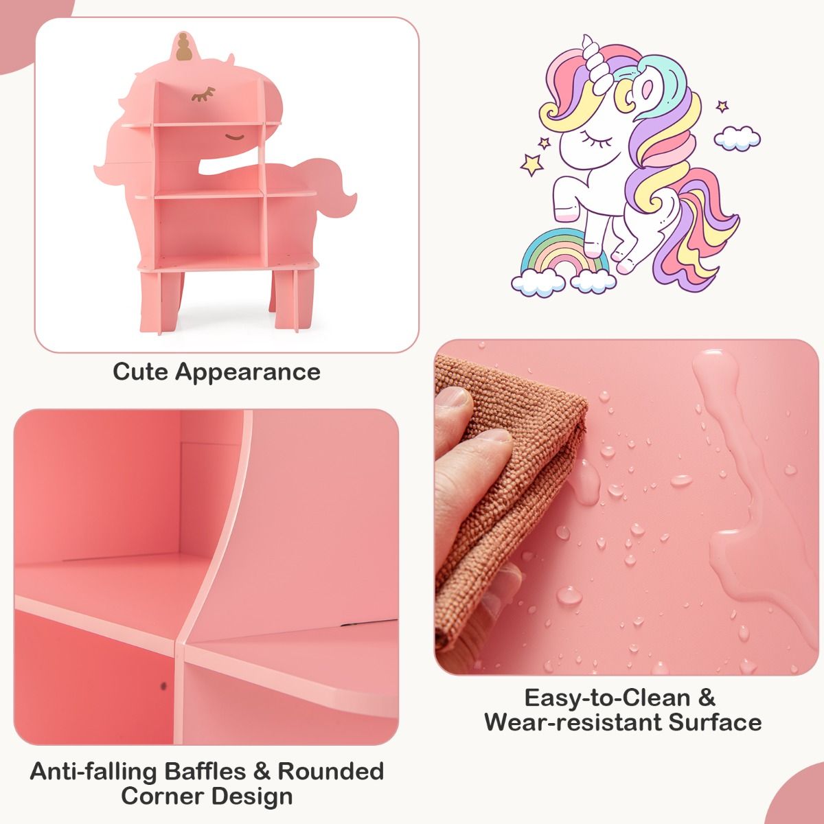 Grâce aux différentes tailles d'étagères, les livres et les jouets peuvent être rangés de manière ordonnée. La forme de licorne et la couleur douce font de l'étagère un ajout attrayant à toute chambre d'enfant, de lecture, d'une salle de jeux ou d'un jardin d'enfants. La surface résistante se nettoie sans effort et reste belle longtemps. et reste belle longtemps.