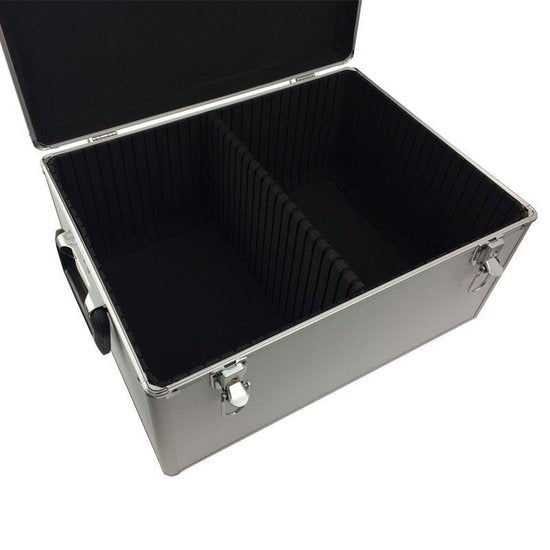 Cet étui pour vinyles et 33 tours est une solution de rangement intelligente, parfaite pour conserver en toute sécurité environ 200 33 tours. Cette mallette offre non seulement une excellente protection à votre précieuse collection de disques, mais aussi un maximum de commodité. Le transport de la valise est confortable et son utilisation est extrêmement pratique. Avec ce flight case pour disques, le transport de vos vinyles est très facile. Les poignées robustes des deux côtés facilitent le transport, et grâce aux coins renforcés et au rembourrage doux à l'intérieur, votre vinyle est protégé de manière optimale. L'espace intérieur est divisé en deux compartiments qui peuvent être agencés de manière flexible selon les besoins. Couleur : aluminium argenté. La valise peut être fermée en toute sécurité à l'aide de deux serrures fournies avec des clés. Les dimensions extérieures sont de 423 mm de large, 317 mm de profondeur et 220 mm de hauteur, tandis que les dimensions intérieures des deux compartiments sont de 195 mm de large, 300 mm de profondeur et 204 mm de hauteur.