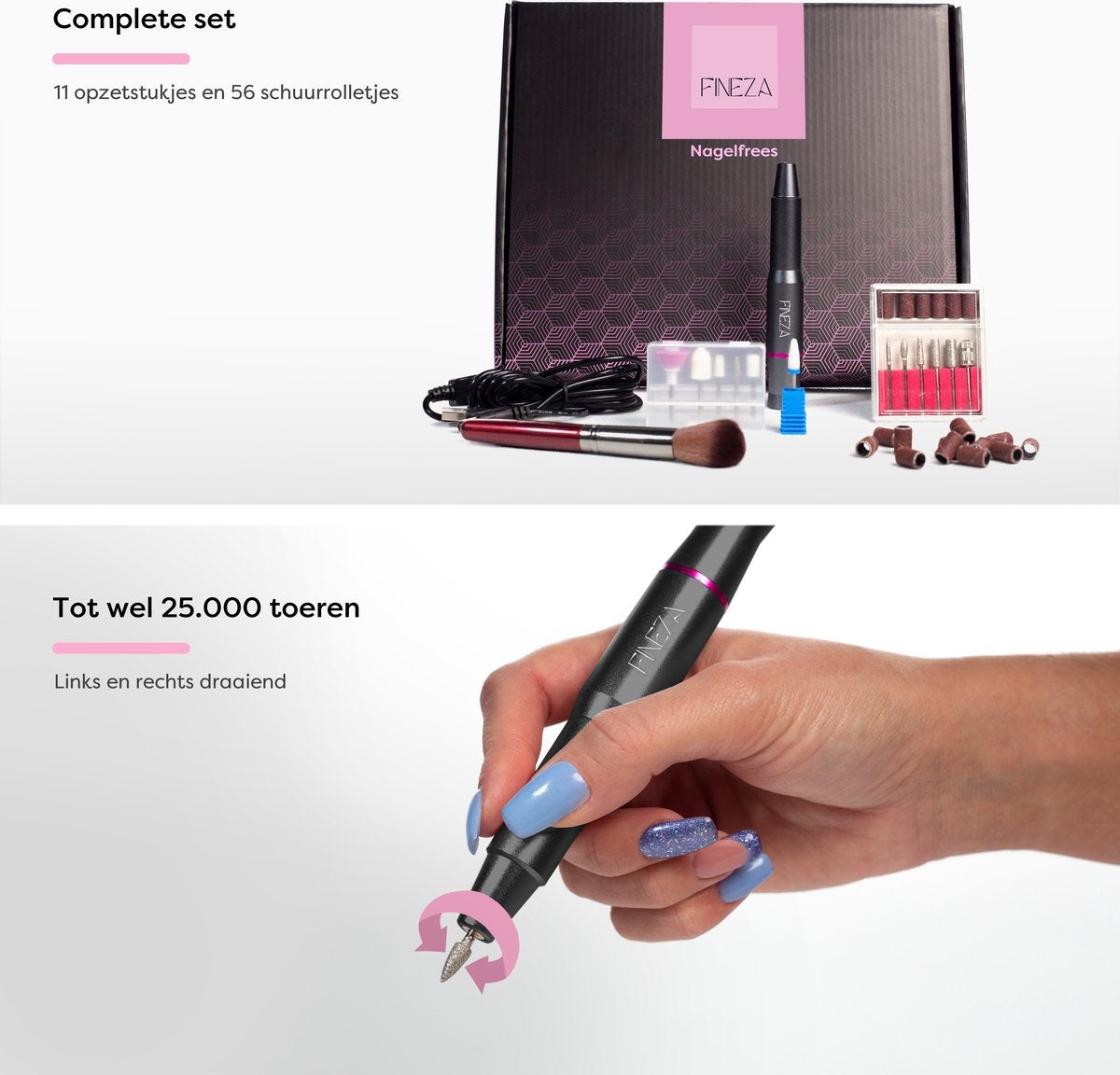 Souhaitez-vous pouvoir vous faire les ongles vous-même à la maison ou disposez-vous d'un studio professionnel de manucure, de pédicure ou d'ongle ? Avec la roulette à ongles Fineza chez vous, vous n'aurez plus jamais besoin d'aller au salon de manucure ou votre propre salon de manucure est parfaitement équipé de matériel professionnel. Avec un moteur silencieux et 25000 tours/minute, vous pouvez limer votre vernis en gel, vos ongles en acrylique, BIAB et autres ongles à la vitesse de l'éclair.