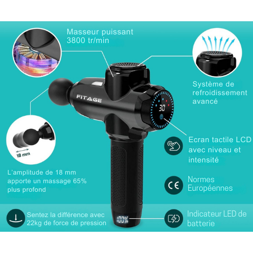 Pistolet de massage professionnel - FITAGE - 12 embouts - Appareil de massage - 30 niveaux d'intensité